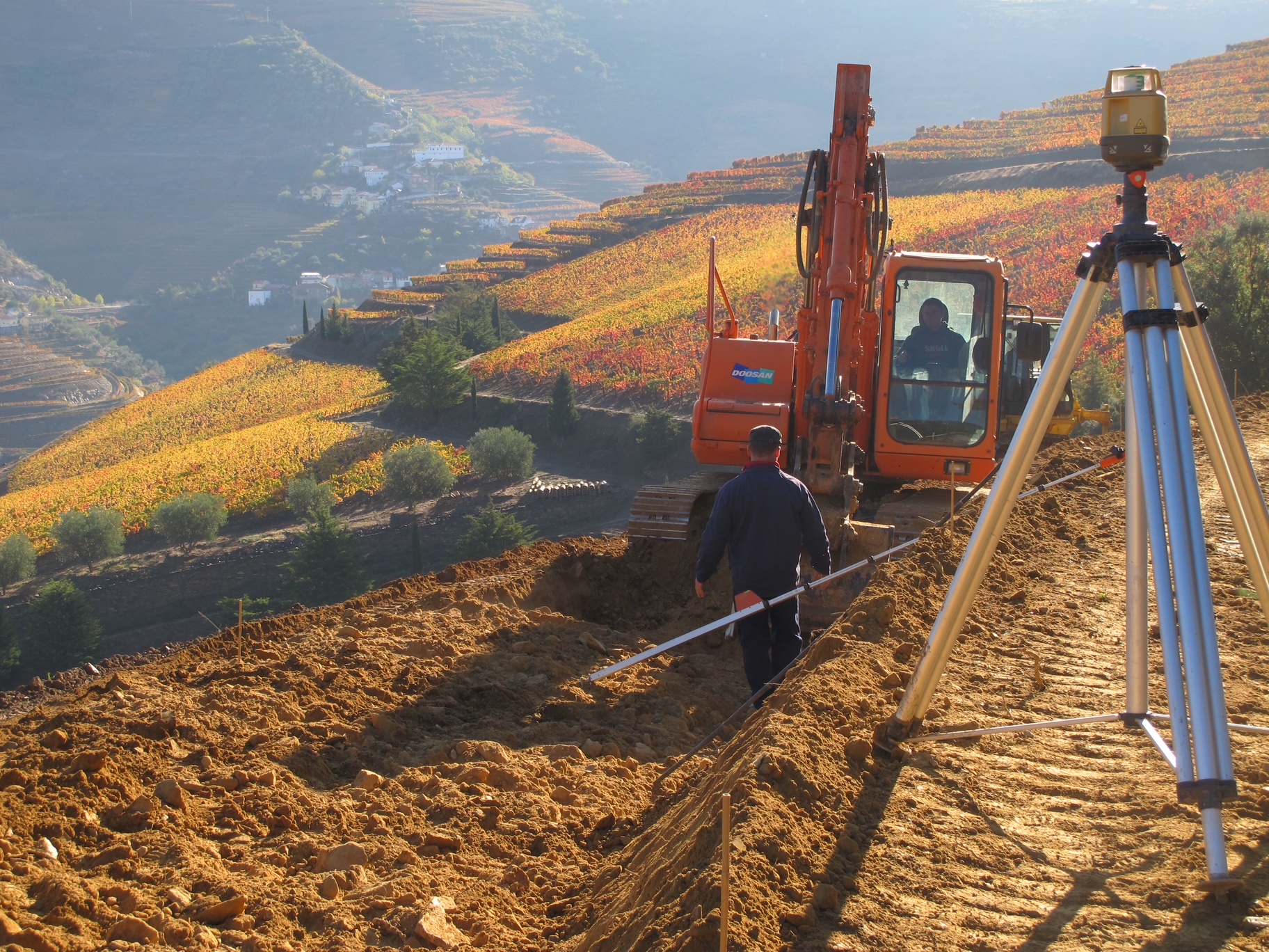 Rain causes erosion in hillside vineyards. Careful land design is therefore essential. Vines were once arranged in terraces supported by dry-stone walls. They are now preferably planted on successive narrow stepped platforms, separated by earthen embankments and laid out with laser guidance to ensure, on each level, a longitudinal gradient of about 3 percent, ideal for draining torrential rainfall.